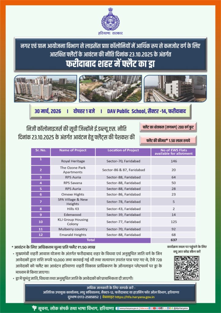 फरीदाबाद, राकेश देव ।अतिरिक्त उपायुक्त सतबीर मान ने जानकारी देते हुए बताया कि नगर एवं ग्राम आयोजना विभाग द्वारा लाइसेंस प्राप्त कॉलोनियों में आर्थिक रूप से कमजोर वर्ग के लिए आरक्षित फ्लैटो के आवंटन हेतु फरीदाबाद शहर में फ्लैटो का ड्रॉ 30 मार्च, 2026 को आयोजित किया जाएगा।उन्होंने बताया कि यह ड्रॉ दोपहर 1 बजे डीएवी पब्लिक स्कूल, सेक्टर-14, फरीदाबाद में संपन्न होगा। इस ड्रॉ के माध्यम से विभिन्न निजी कॉलोनाइजर्स द्वारा प्रस्तुत परियोजनाओं में उपलब्ध ईडब्ल्यूएस श्रेणी के फ्लैटो का पारदर्शी तरीके से आवंटन किया जाएगा।